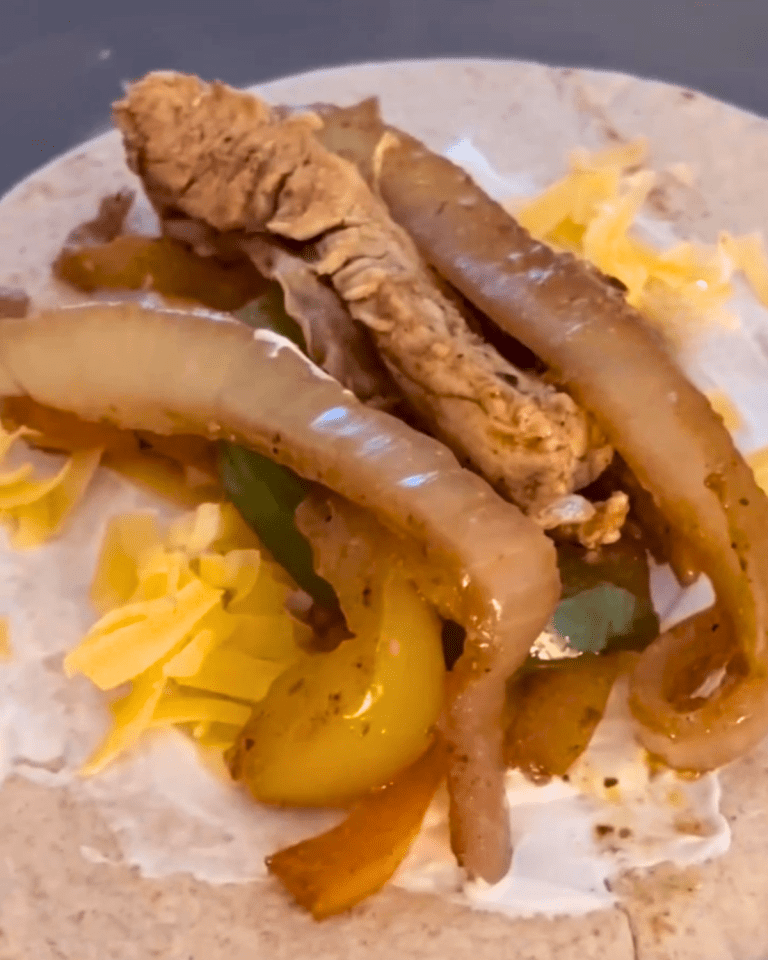 To serve, spread a layer of sour cream onto each warm tortilla. Sprinkle with shredded cheese, then spoon the hot chicken, onion, and pepper mixture over the top. Fold and enjoy immediately.