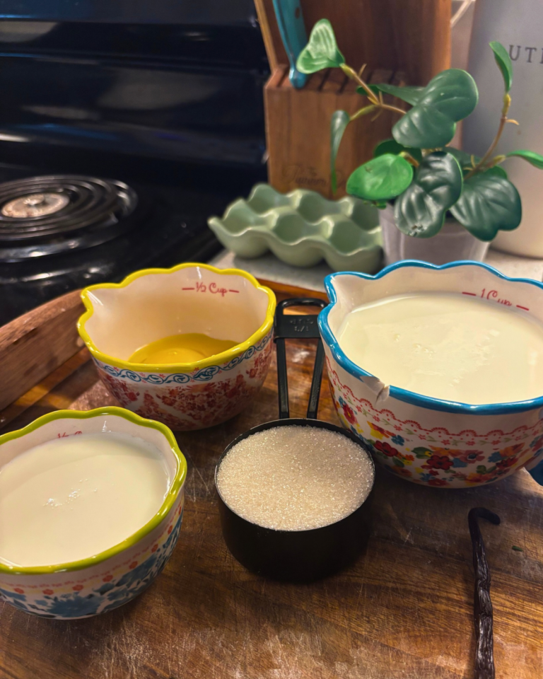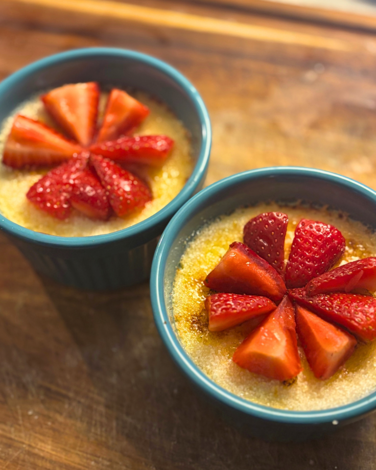 The custard baked up silky and smooth, with that signature “tap, tap” sound when we broke through the caramelized sugar crust. I topped ours with strawberries, sliced like little crowns, because Joanna would want it to look pretty.