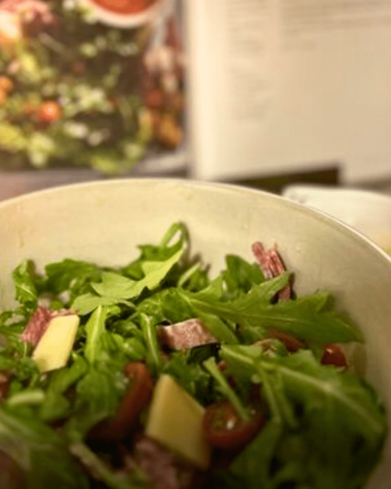 - The antipasto salad was heavy on the cheese and salami (because me) and light on lettuce (also because me). I built it on a big wooden board, which made it feel a little extra — in the best way.