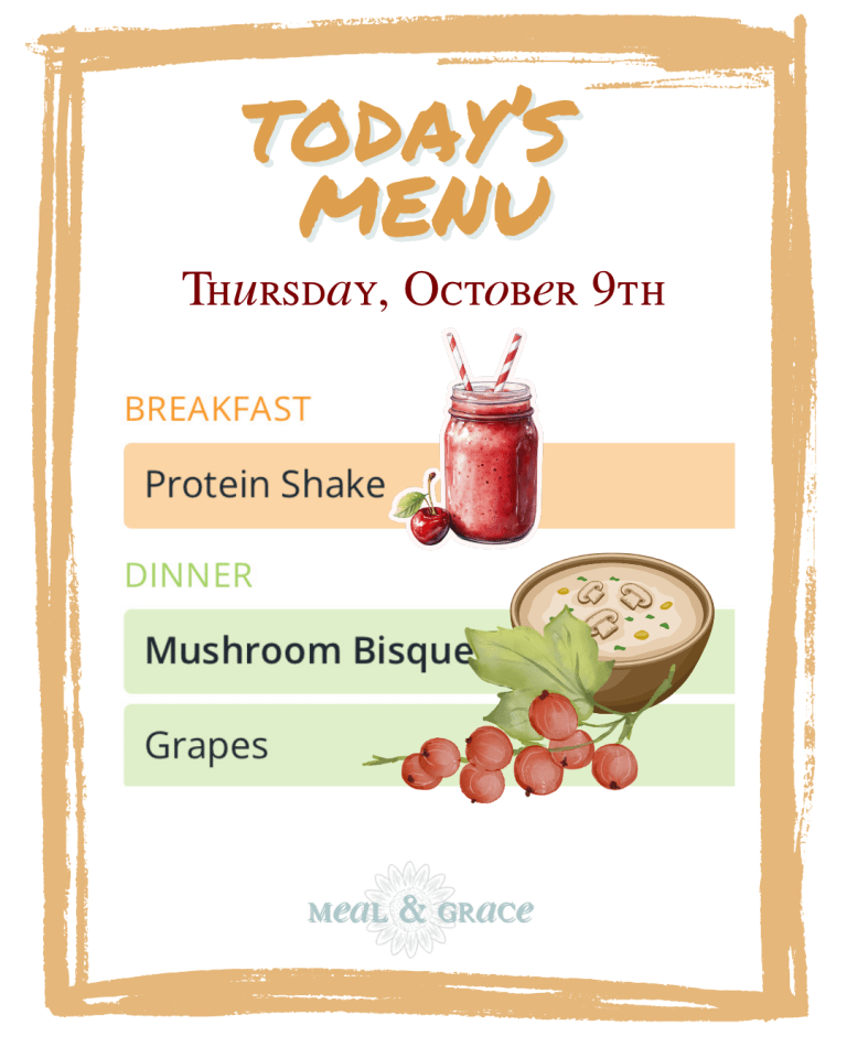 Breakfast will be a Protein Shake, the kind of start that asks nothing more than a good blend and a moment to breathe before the day begins. Dinner, though, leans into comfort — a bowl of Mushroom Bisque, creamy and woodsy with the depth that only mushrooms can give. It’s a small bowl, paired with a handful of grapes, but it’s enough. Some meals aren’t about fullness; they’re about slowing down. About noticing how warmth and flavor can make even an ordinary Thursday feel gentle.