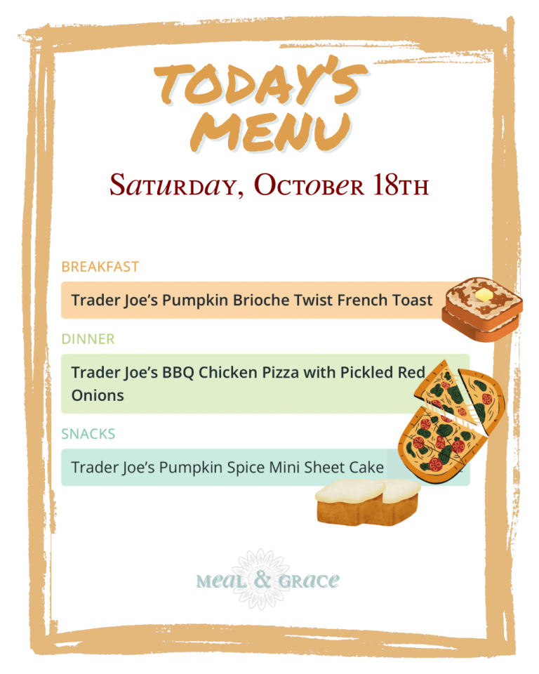 Saturday feels like the perfect day to lean into Trader Joe’s magic — shelves lined with pumpkin everything and the comfort of knowing dinner can come straight from the oven.