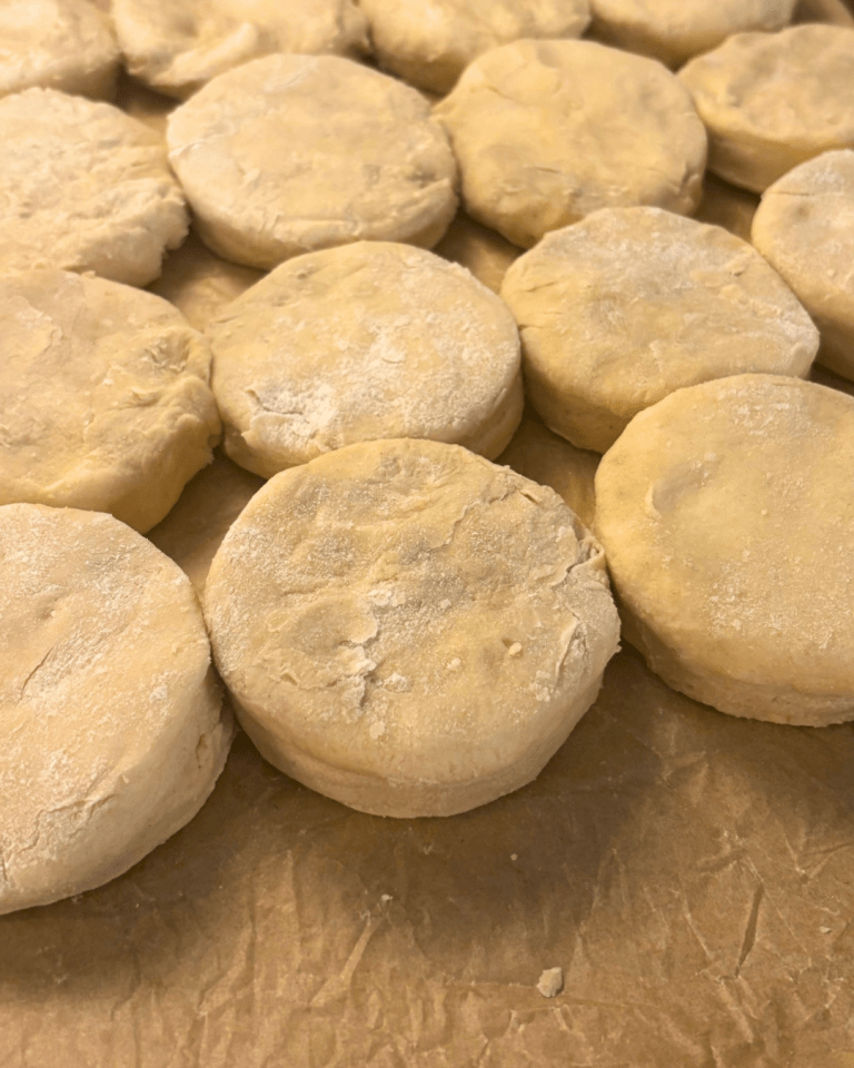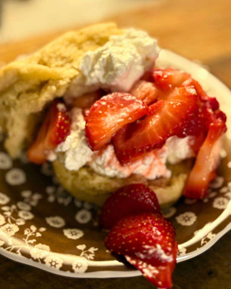 By Sunday, those same biscuits had a second act: sliced open and topped with fresh strawberries and homemade whipped cream.