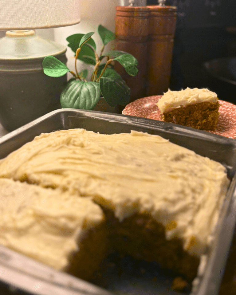When it cooled, I spread on the cream cheese frosting — thick, smooth, and just tangy enough to balance the sweetness. A sprinkle of cinnamon and sugar on top made it look as good as it tasted.